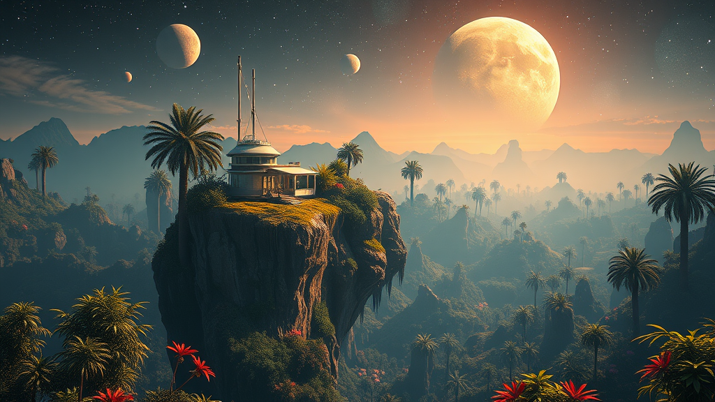 Panoramic view of an extraterrestrial jungle world, featuring a futuristic house perched atop a rugged cliff, reminiscent of Horizon Zero Dawn aesthetics. Soft volumetric lighting filters through the alien flora, creating a dreamlike atmosphere. Vivid colors animate the landscape under a sky filled with strange celestial bodies, in exquisite 8k resolution, maintaining an aspect ratio of 3:2.