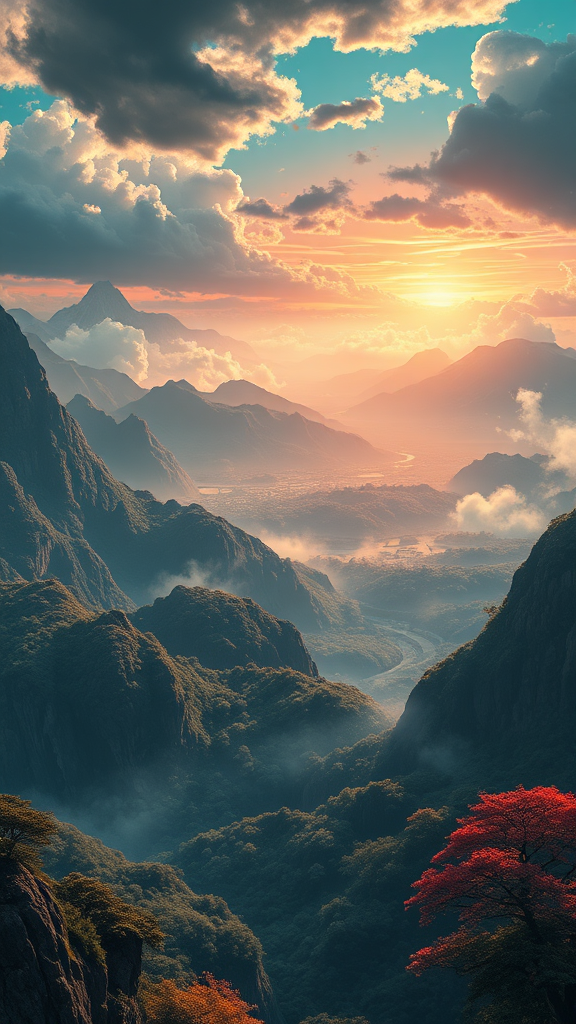 Panoramic vista of a breathtaking Japanese landscape, reminiscent of Kingdom Hearts style, with dynamic brushstrokes and dramatic light contrasts, ultra-high definition 8k resolution --aspect ratio 3:2, infused with subtle surreal elements.