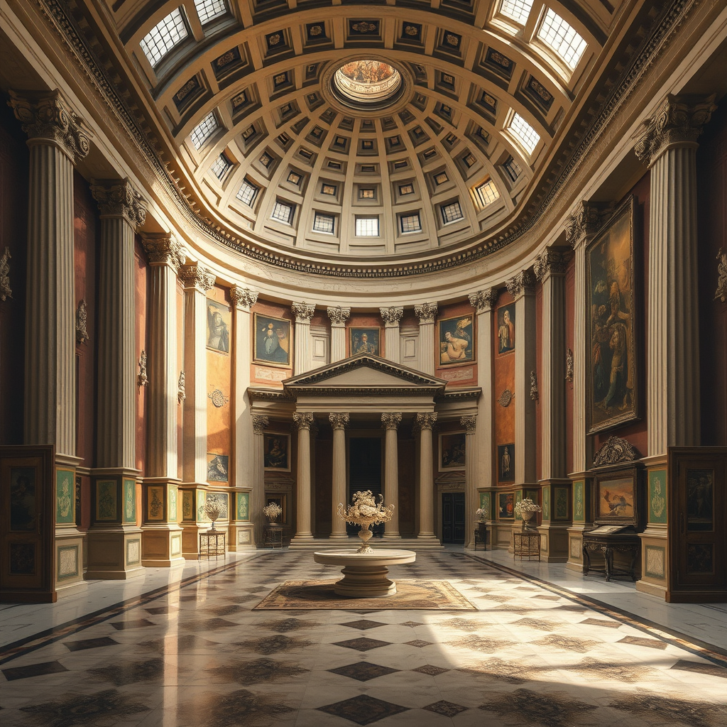 Pantheon Rome Louvre inspired domestic interiors, 19th-century American painting and works on paper, blending interdisciplinary art with kintsugi aesthetics, focusing on large canvas sizes, symmetry, intricate naturalism, incorporating warm tones and soft lighting, capturing the grandeur and elegance of classical architecture with modern interpretations.