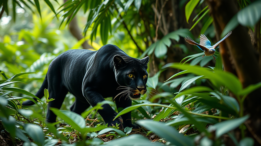 Panthera onca prowling through lush rainforest, sapphire-breasted phimeis dives fluttering nearby, captured on Canon EOS Rebel SL3, EF100mm, f/2.8L, Macro IS USM, aperture f/2.8, focal length 100mm, shutter speed 1/800, ISO 200