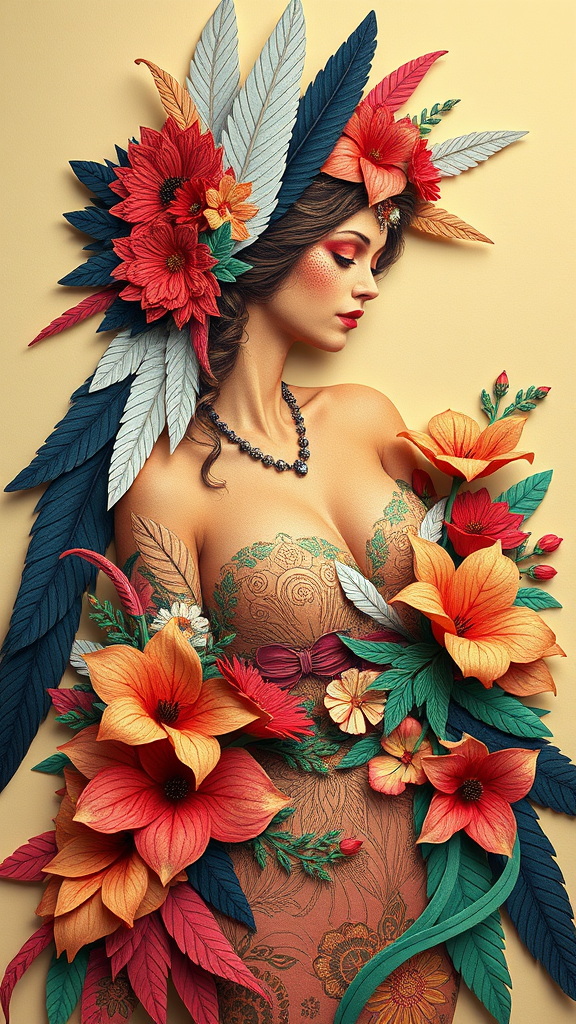 Paper craft style voluptuous concubine adorned with feathers and flowers, inspired by Ernst Haeckel and Maria Sibylla Merian. A fusion of styles from Tristan Eaton, Victo Ngai, Artgerm, Rhads, Ross Draws, Kaethe Butcher, Hajime Sorayama, Greg Tocchini, and Virgil Finlay. Embrace a sci-fi essence with vibrant colors, neon lights, and digital painting techniques reminiscent of Ilya Kuvshinov. Achieve 8k UHD quality with HDR effects, ensuring clarity and richness. Avoid visual distortions like duplicated or mutated features. Keep the focus crisp, avoiding low resolution, out-of-frame elements, or artifacts. Exclude any text, logos, or watermarks for a seamless visual experience.