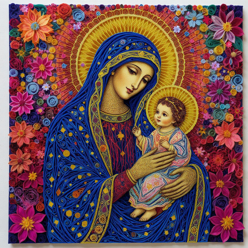 A vibrant paper quilling artwork depicting the Virgin Mary cradling baby Jesus, featuring an array of swirling, vivid colors that bring the figures to life. The delicate quilled strands form a mosaic of intricate patterns, creating a flowing robe for Mary in shades of deep blue and gold, while baby Jesus is wrapped in a gentle blend of pastel hues. The background bursts with a dynamic splash of floral and geometric designs, embodying a sense of divine warmth and serene grace.
