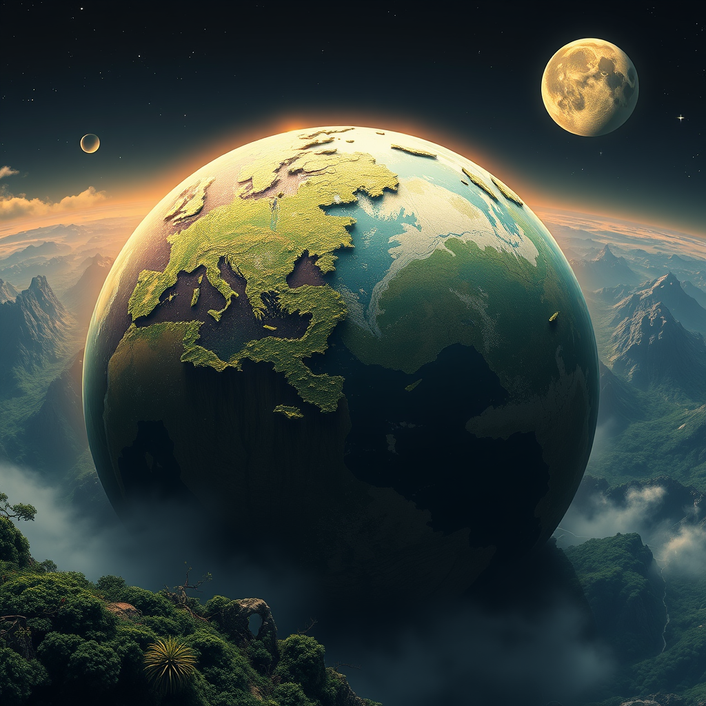 Parallel Terra, a world similar to ours yet subtly distinct, where continents mingle in unexpected configurations, the sky paints itself in two moons' glow, and species evolved along divergent paths in perfect harmony with mysterious, verdant landscapes.