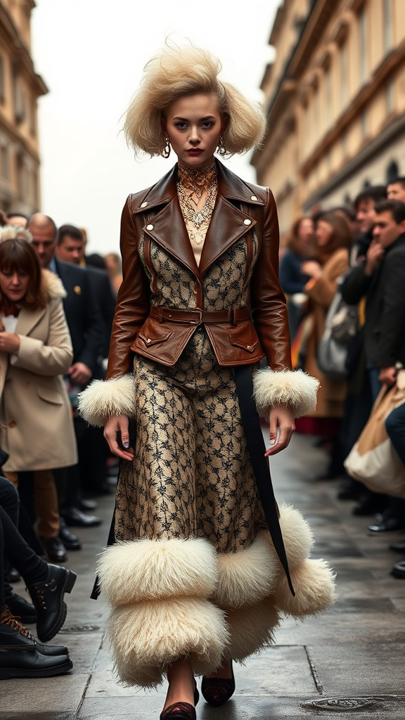 Paris Fashion Week Fall 2017, captured through the lens of Irving Penn, featuring an ivory palette with a poodlepunk twist. Blending the elegance of the 1860–1969 fashion era with modern leather textures, inspired by Richard Doyle's whimsical designs. A harmonious fusion of ready-made avant-garde and classic couture, presented in a rich, raw style with a 2:3 aspect ratio, emphasizing intricate detailing and artistic boldness.