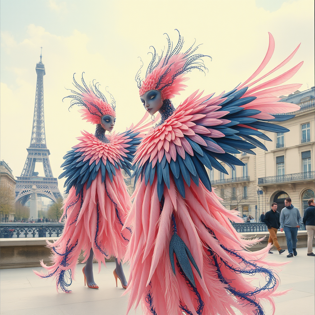 Paris Women's Week 1999, where whimsical imaginative beings grace the pastel dreamscape, inspired by the vibrant strokes of Kees van Dongen. They dance with the surreal ingenuity of Sebastian Errazuriz and the delicate ethereal beauty of Fuyuko Matsui. Cloaked in hues of pink and indigo, these enchanting creatures are adorned with intricate feathers that glimmer softly, transforming the city into a tapestry of enchanting wonder and surreal elegance.