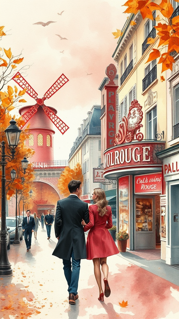 Parisian paintings capture the essence of romance and nostalgia, showcasing scenes of lovers strolling through the vibrant streets in the early evening of an autumn day, circa 1950. Inspired by the style of watercolorist Mark League, these artworks feature skillful compositions with rough textures that evoke a sense of depth and warmth. Pink champagne hues wash over iconic landmarks like the Moulin Rouge, blending seamlessly with the golden tones of fallen leaves. The scene invites viewers to step back in time, immersed in a world where art and love intertwine amidst the enchanting ambiance of Paris.