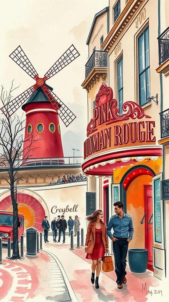 Parisian paintings capturing the charm of pink champagne under the style of Mark League, a master watercolorist known for his skillful compositions. Featuring a rough texture that embodies the nostalgic spirit of the Autumn season during the early evenings of 1950. Lovers are seen strolling near the iconic Moulin Rouge, adding a romantic flair to the scene.