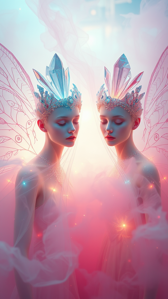 Pastel hues, abstract aesthetics, ethereal image of enchanted figures enveloped in glimmering lights within a dreamy haze of vibrant mist, crystals embellishing their crowns. Stillness and mysterious allure, surrealism, interplay of color and form, emotional expression, and imagination, official artwork, a masterpiece, flawless anatomy, 32k UHD resolution, exceptional quality, high-resolution, lifelike photography, professional capture, cinematic perspective, soft lighting, entire figure captured from a distance, medium shot, engaging the viewer.