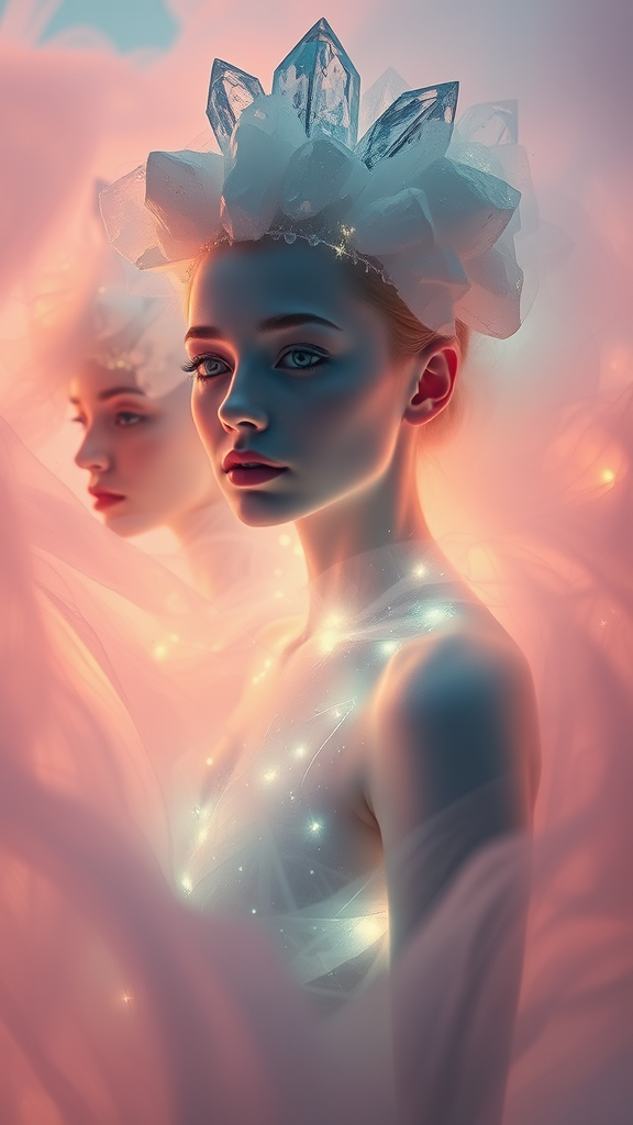 Pastel hues, abstract design, ethereal photograph of mystical figures enveloped in shimmering lights amidst a dreamy swirl of vibrant mist, crystals crowning their heads. Stillness and elusive beauty, surrealism, color and form, emotional resonance, boundless imagination, official artwork, artistic masterpiece, flawless anatomy, 32k UHD resolution, superior quality, high-resolution, lifelike photography, professional capture, cinematic perspective, dramatic lighting, entire body shot from afar, cowboy shot, engaging eye contact.