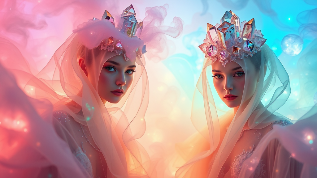 Pastel hues drift through abstract forms, capturing ethereal beings cloaked in shimmering lights enveloped by a dreamy cascade of colorful mist. Crystals crown their heads, exuding a sense of stillness and elusive allure. Surrealism weaves through, melding color and form in an exquisite dance of emotional expression and imagination. This official artistic piece, a masterpiece of immaculate anatomy, unfolds in breathtaking 32k UHD resolution, representing the pinnacle of high-quality realism. The scene is professionally photographed with a dynamic cinematic perspective, illuminated by cinematic lights. The composition captures the full body from a distance, reminiscent of a cowboy shot, as the figures gaze directly at the viewer.