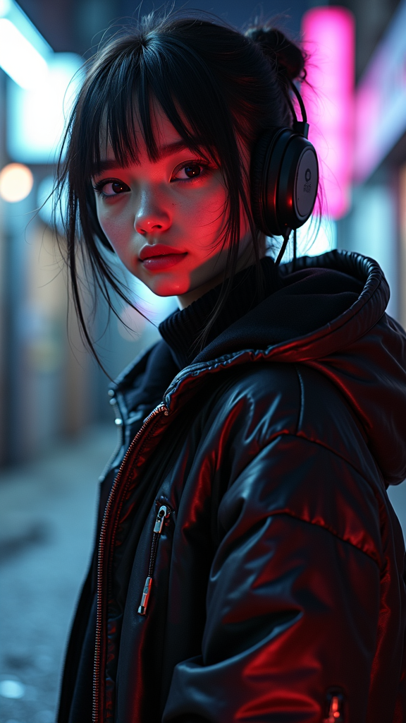 pastel lighting, enigmatic smile, striking and vivid eyes; stunning young cyborg girl in a style reminiscent of Deus Ex Mankind Divided; stylishly worn jacket in a fashion magazine aesthetic, outerwear, urban nightscape, situated inside a gritty alley, naturally shiny, maximally natural hair, 150mm, ISO 100, fixing natural imperfections, subpar clothing, distorted fabric lines, computer-generated imagery, jpeg artifacts, tangled hair, cropped, wearing headphones, anatomical inaccuracies, surreal anatomy, floating limbs, disconnected appendages, mutations, unattractive, unclear, severed appendages.