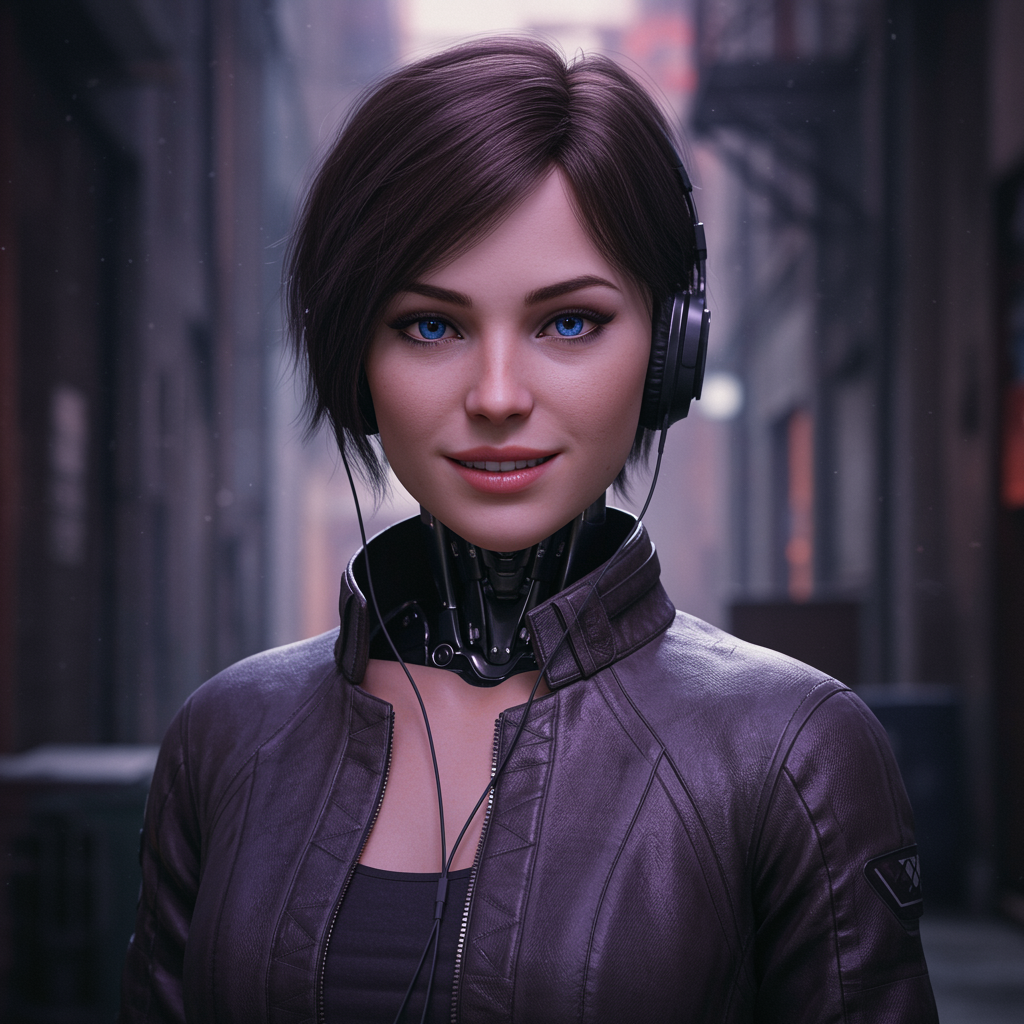 pastel lighting, enigmatic smile, vibrant and striking eyes, stunning young cyborg girl in the style of Deus Ex Mankind Divided, stylish billowing jacket reminiscent of fashion magazine designs, clothing jacket, set in a dimly lit slum alley, naturally shiny and immaculate hair, photographed with a 150mm lens, ISO 100 settings, intricately detailed attire, seamless fabric lines, clear digital presentation, urban backdrop, headphones subtly incorporated, well-proportioned anatomy, coherent limbs, unified appearance, sharp and focused imagery, avoiding any distortions or artifacts.