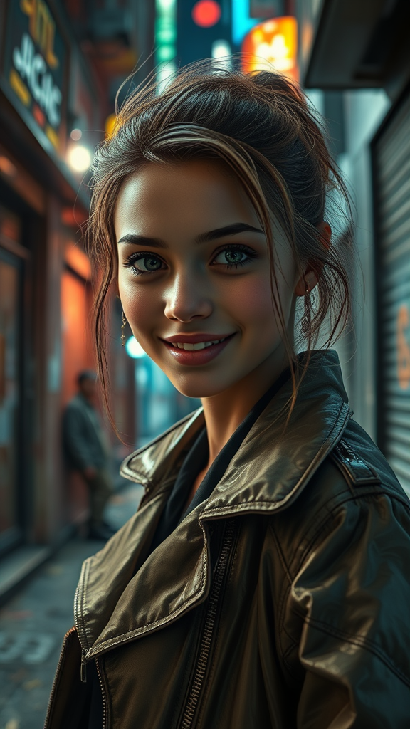 Pastel lighting, enigmatic smile, bright and captivating eyes, stunning young cyborg girl in Deus Ex Mankind Divided style, chic blown jacket reminiscent of fashion magazine allure, set against a vibrant night city backdrop, nestled within a slum alley, naturally glossy, impeccably natural hair, shot with a 150mm lens at ISO 100. Despite the urban grit, the scene enhances her distinct beauty. The focus emphasizes the intricate details, avoiding digital anomalies like jpeg artifacts. With artistry and precision, the image steers clear of poorly drawn elements, ensuring flawless anatomy without extra or missing limbs, maintaining a clean and authentic presentation.