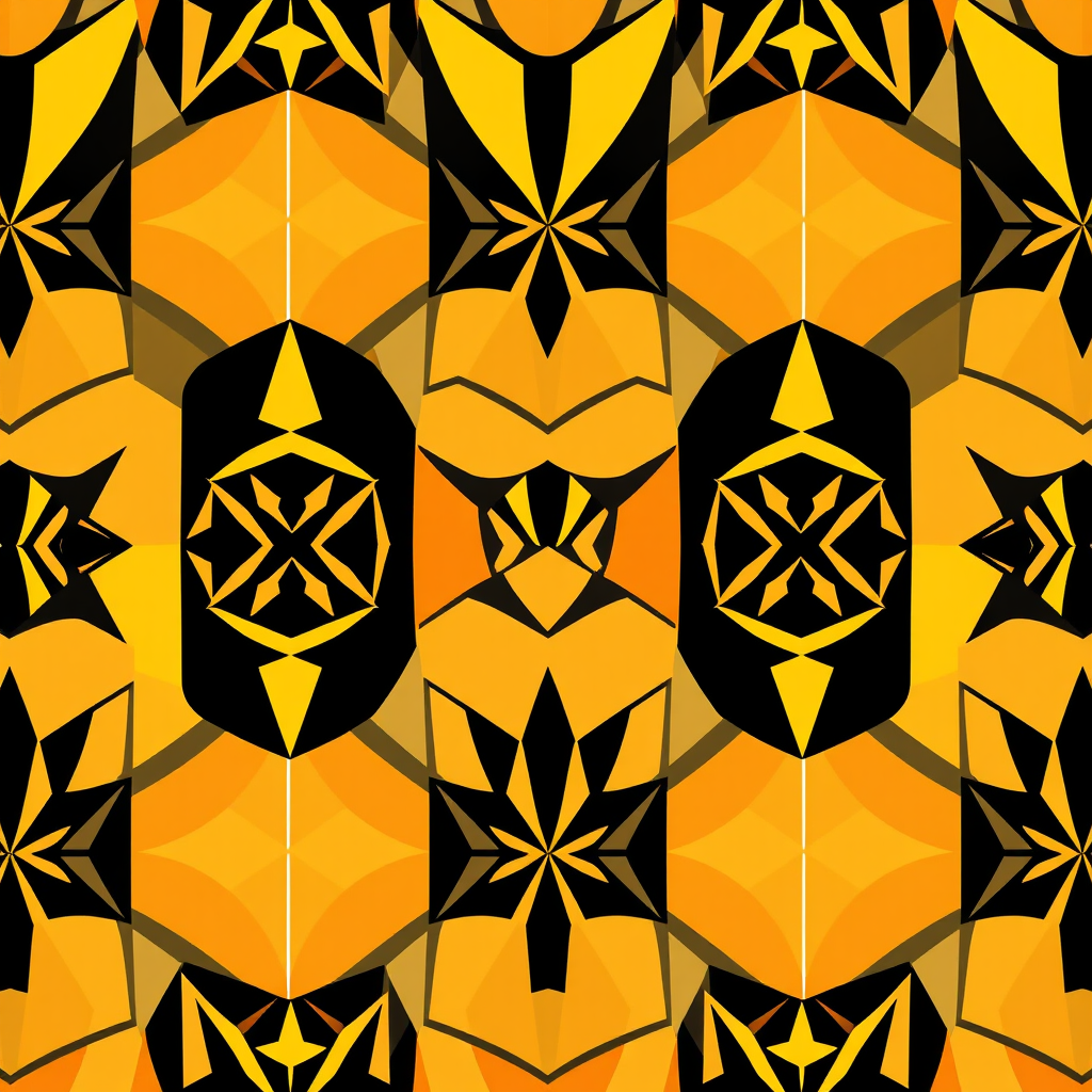 Pattern illustration featuring a dynamic interplay of abstract geometric shapes, utilizing a monochrome palette with a spectrum of yellow and orange shades. This design showcases a seamless, repeating pattern with abstract forms, highlighting a sophisticated balance between complexity and modernity. The artwork's elongated aspect ratio emphasizes the vertical flow and intricate continuity of the geometric motifs, adding unique variations while preserving the essence of contemporary aesthetics.
