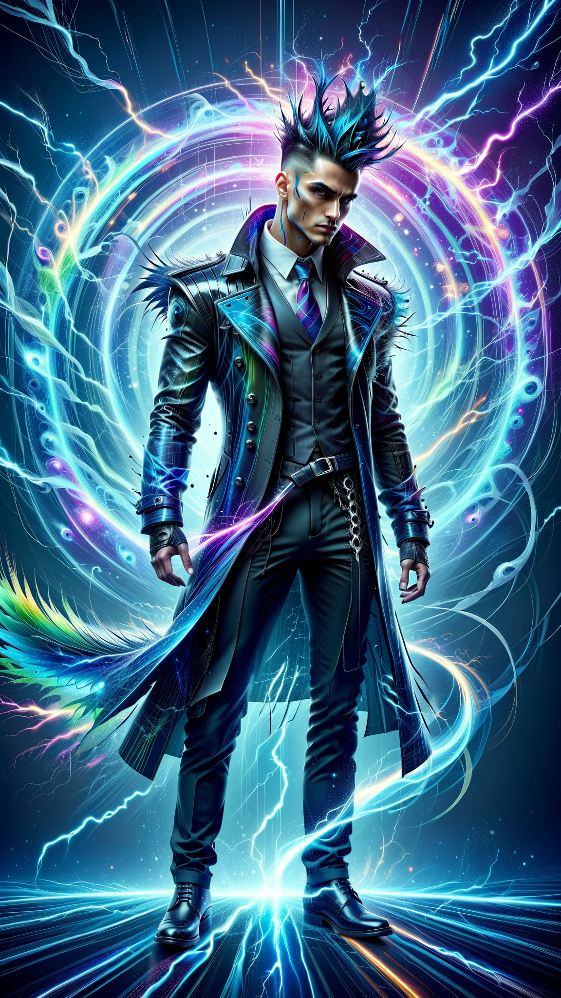 Peacock Punk, New Wave wizard with cosmic powers. Multi-colored energy emitted from his hands. Masculine male; tall, strong, fit, lithe but muscular. Short black hair, Mohawk fade hairstyle with spiky blue and purple highlights. Strong brow and chin, handsome face with silver eyes, neon make-up. Shiny metallic dark blue trenchcoat . Black long sleeved shirt with metallic blue tie. Black leather studded belt around his waist. Pleated black pants with rainbow lines in various swirly patterns. Black leather dress shoes. Full body pose, trenchcoat blown open by wind.