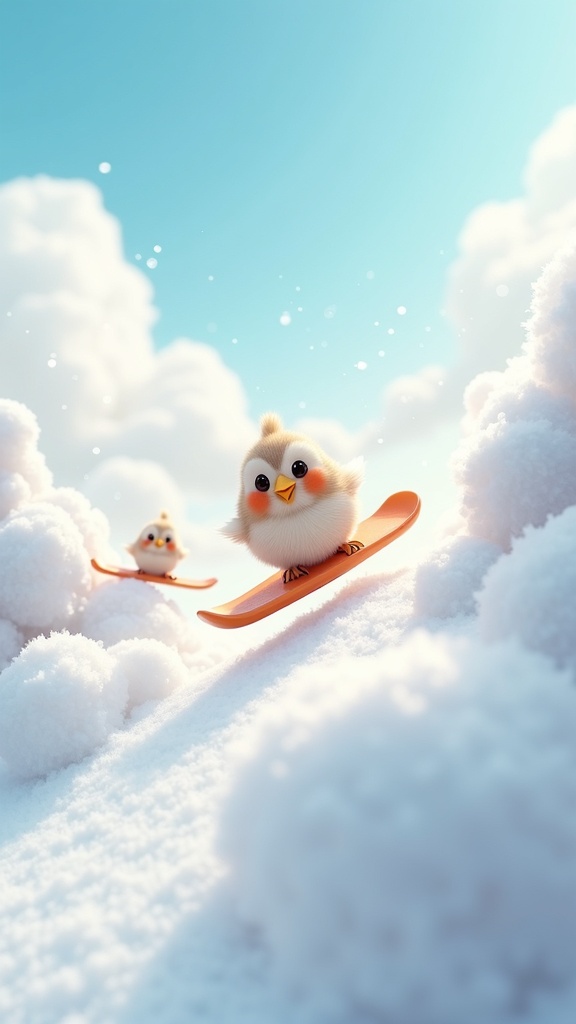 View this AI-generated image featuring in the creamy peaks of the candyfloss hills tiny sparrowfolk glide gracefully on their snowboards weaving through the puffy clouds of sugar. Created using advanced AI technology, this image showcases creative visuals, AI artwork. Perfect for creative projects,