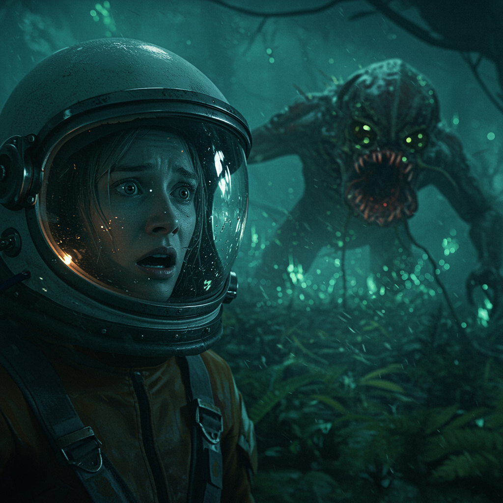 An astronaut peers through her helmet with wide, terrified eyes as a monstrous creature closes in on her. The alien landscape around her is shrouded in darkness, with a thick, damp mist hovering close to the ground, illuminated only by the flickering lights of distant, bioluminescent flora casting eerie shadows.