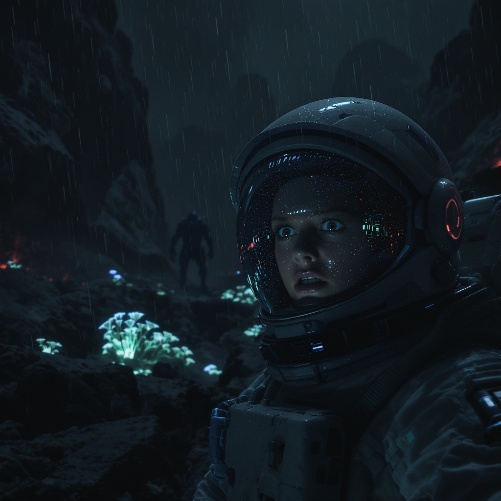 The astronaut peers through her helmet, eyes wide with terror as an otherworldly creature lurks ever closer. The alien planet surrounding her is shrouded in darkness, the damp air thick with tension. Strange, bioluminescent flora cast eerie shadows across the rocky landscape, heightening the sense of impending doom. Each step echoes ominously in the desolate silence, as the horrifying silhouette of the creature inches nearer, its features obscured but its intent unmistakable.