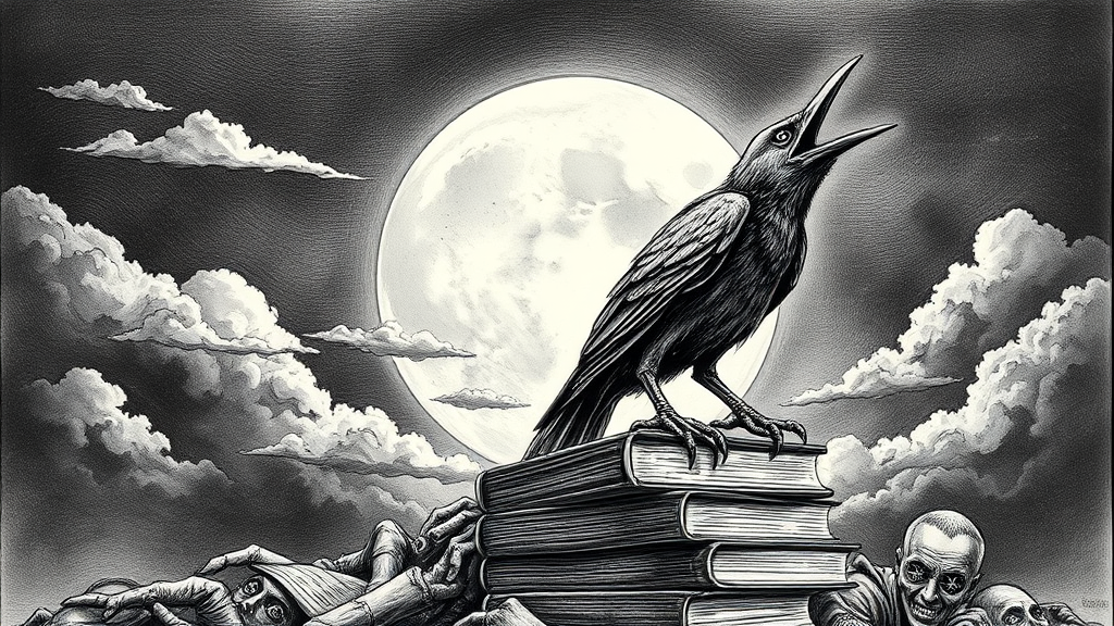 Pen and ink drawing inspired by Edgar Allan Poe depicting an open-beaked bird squawking atop a pile of books with a full moon partially obscured by drifting clouds in the background. The scene is rendered with extreme intricacy and gothic horror elements, highlighting an eerie, gloomy atmosphere with intense moody and dramatic illumination. The artwork captures the unsettling essence with deformed eyes featuring crosshairs, subtly suggesting madness. Paradoxical body elements include cloned faces and extra fingers on mutated hands. Despite being cropped and low resolution, the piece evokes a sense of unsettling wonder, with careful avoidance of text, jpeg artifacts, or identifiable marks such as signatures or watermarks. The bird's elongated neck accentuates its haunting presence, slightly out of the frame, adding to the enigmatic allure.