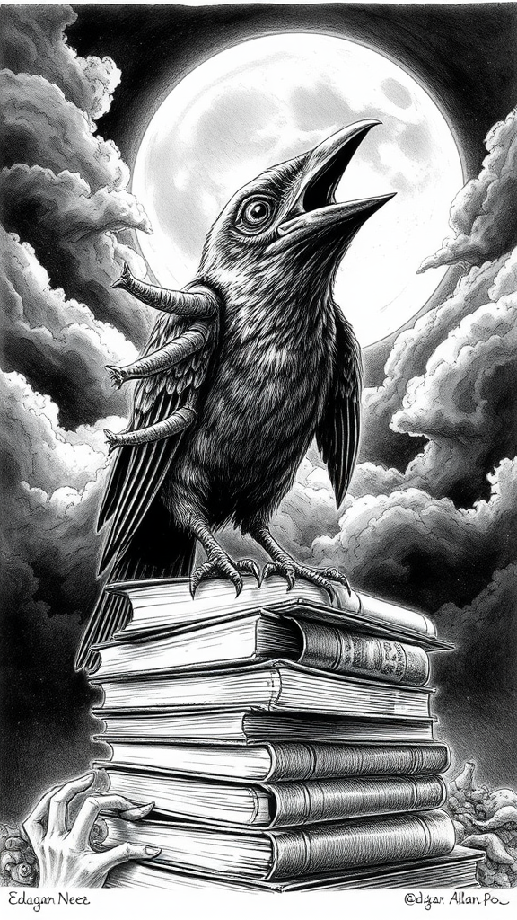 Pen and ink drawing, inspired by Edgar Allan Poe, featuring a bird with an open beak, squawking atop a pile of books. A full moon peeks through shrouding clouds, casting an intense, eerie glow over the scene. The artwork is rich with extreme and intricate detail, encapsulating the essence of Gothic horror. The illumination is moody and dramatic, capturing the haunting atmosphere. Unusual features such as deformed irises, peculiar pupils, and distorted eyes add to the unsettling aura. The bird appears slightly cross-eyed with a cloned face and has extra fingers on its mutated wings. The composition includes elements of distortion like an elongated neck, and some features are intentionally out of frame. The artwork eschews any low-resolution images, text, jpeg artifacts, signatures, watermarks, or artist names, ensuring the focus remains on its hauntingly beautiful and bizarre nature.
