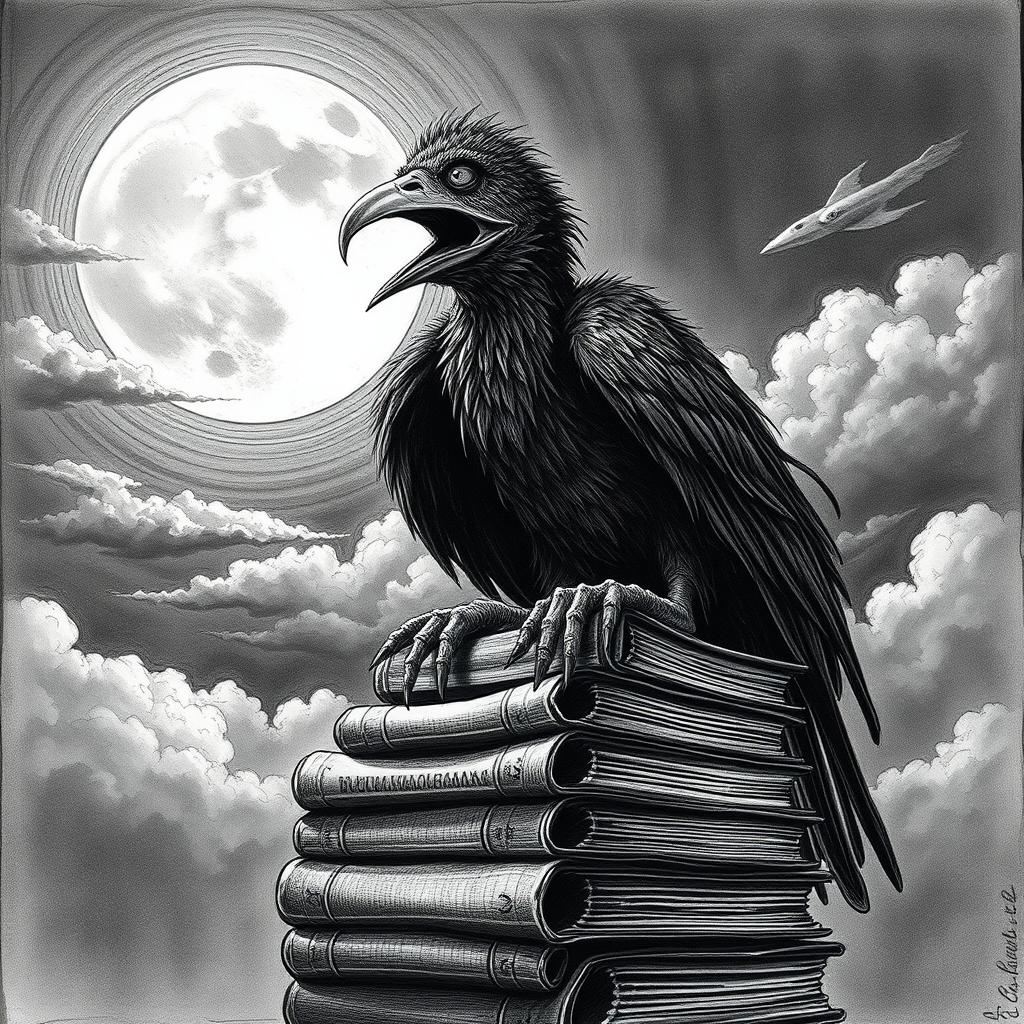 Pen and ink drawing inspired by Edgar Allan Poe, featuring an open-beaked, squawking creature perched atop a pile of books. The scene is illuminated by a full moon partially obscured by drifting clouds, casting an eerie and gloomy light. The artwork showcases extreme and intricate detail, embodying the essence of Gothic horror. The atmosphere is intensely moody and dramatic, with high definition and rich contrast. The creature has deformed eyes, including a cross-eyed expression, alongside peculiar anatomical features such as extra fingers and mutated hands. The creature is depicted with a long neck, contributing to its unsettling appearance. The composition is closely cropped, focusing on the central elements, while avoiding common digital imperfections like low resolution, text artifacts, or distracting signatures. The overall aesthetic is dark and mysterious, capturing the viewer's imagination with its haunting storytelling.