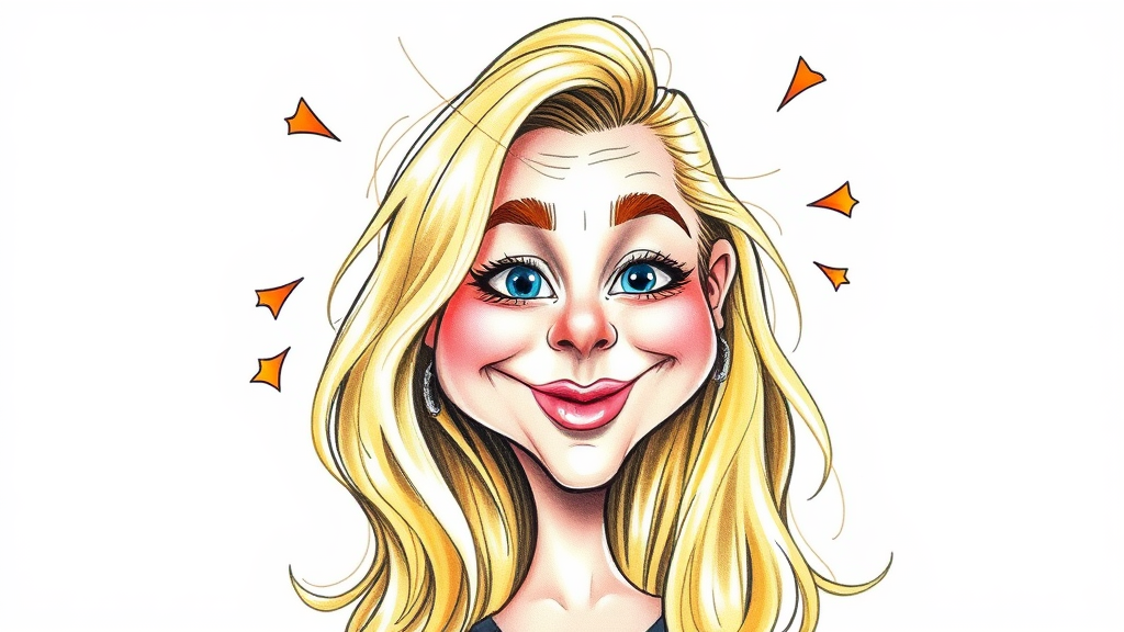 Pencil drawing caricature featuring a cute woman in her mid-20s with blonde hair, created using color pencils. The style is reminiscent of a street artist's flair, capturing humor through hilariously exaggerated features. Set against a white background, the composition adds an element of playfulness and whimsy, with a touch of chaos and high stylization for a unique and vivid effect.