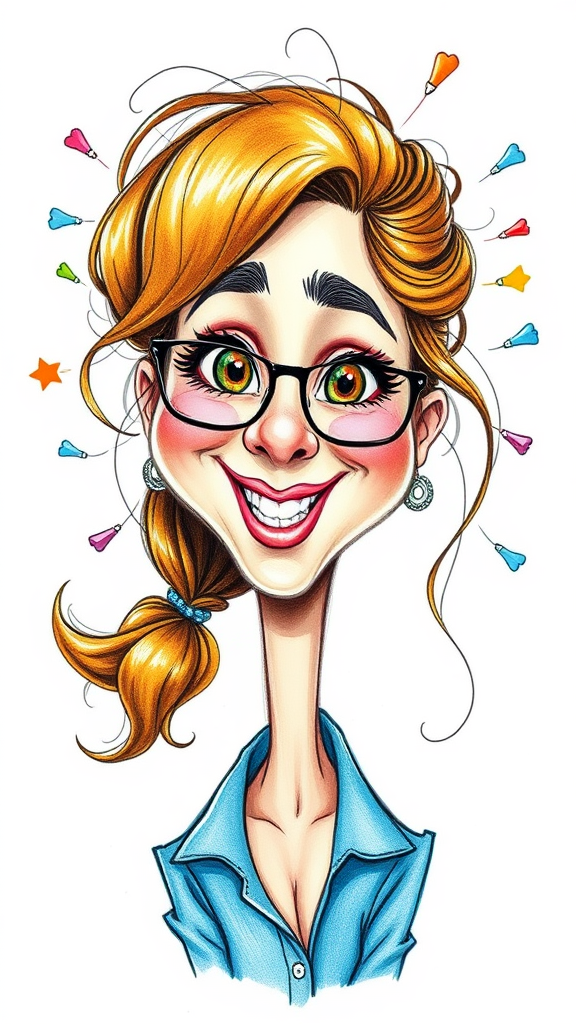 Pencil drawing caricature of a charming woman in her mid-20s, brought to life with vibrant color pencils, echoing Pixar's whimsical style. Her features are humorously exaggerated, capturing her playful essence against a crisp white backdrop, with delightful chaos and a touch of stylish flair.