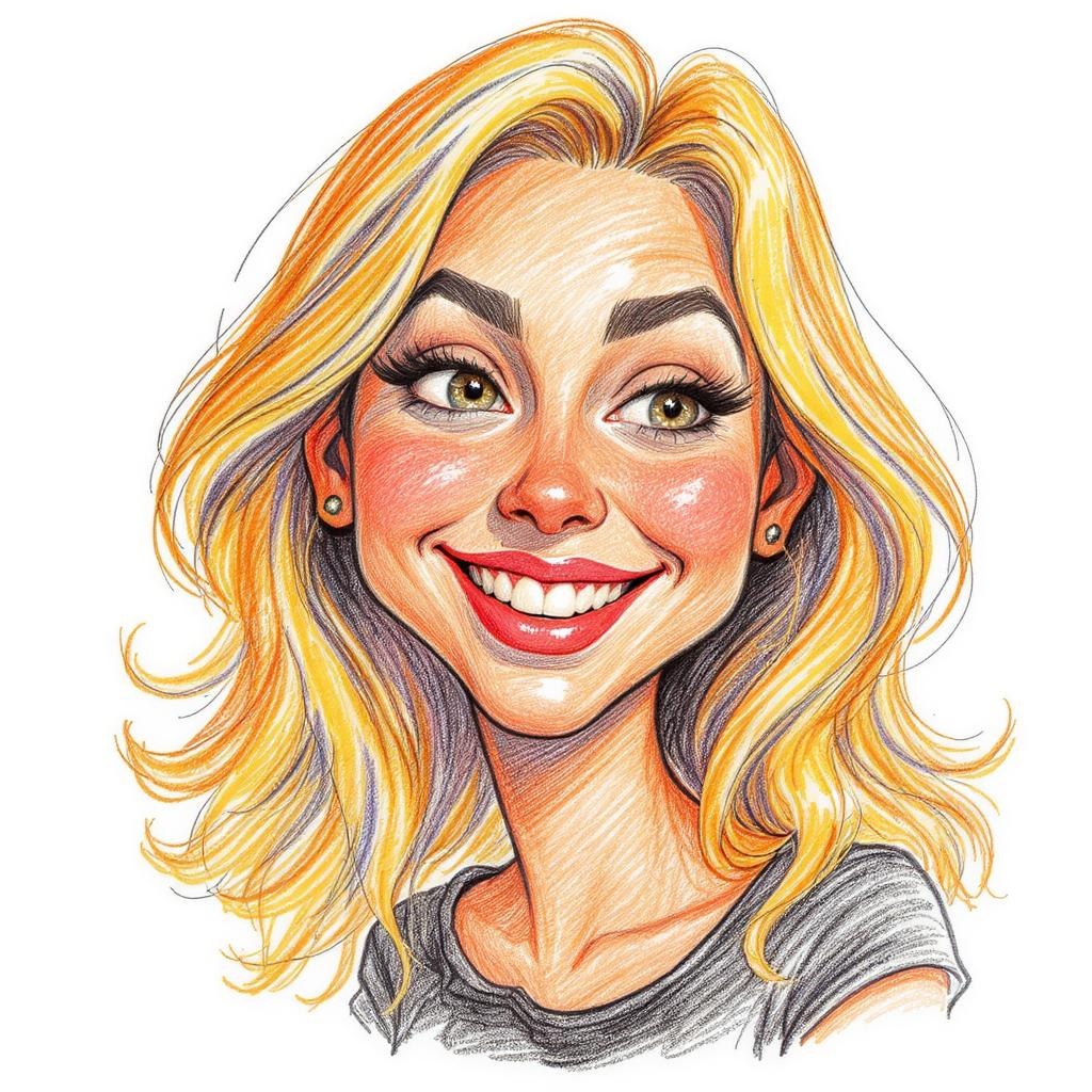 Pencil drawing of a caricature, delightful young woman, golden blonde hair, mid-20's, using vibrant colored pencils, reminiscent of street caricature artists, comically amusing, with exaggerated facial features, set against a plain white backdrop, with a playful twist, ratio 1:2, enhanced stylization.