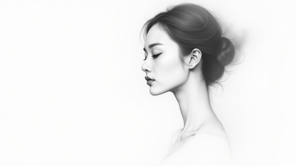 View this AI-generated image featuring a delicate pencil sketch inspired by odilon redon depicting the face of a stunning asian woman in profile showcasing a subtle enigmatic smile the artwork features prominent charcoal traces set against a stark white background the piece exudes a sense of eleganc