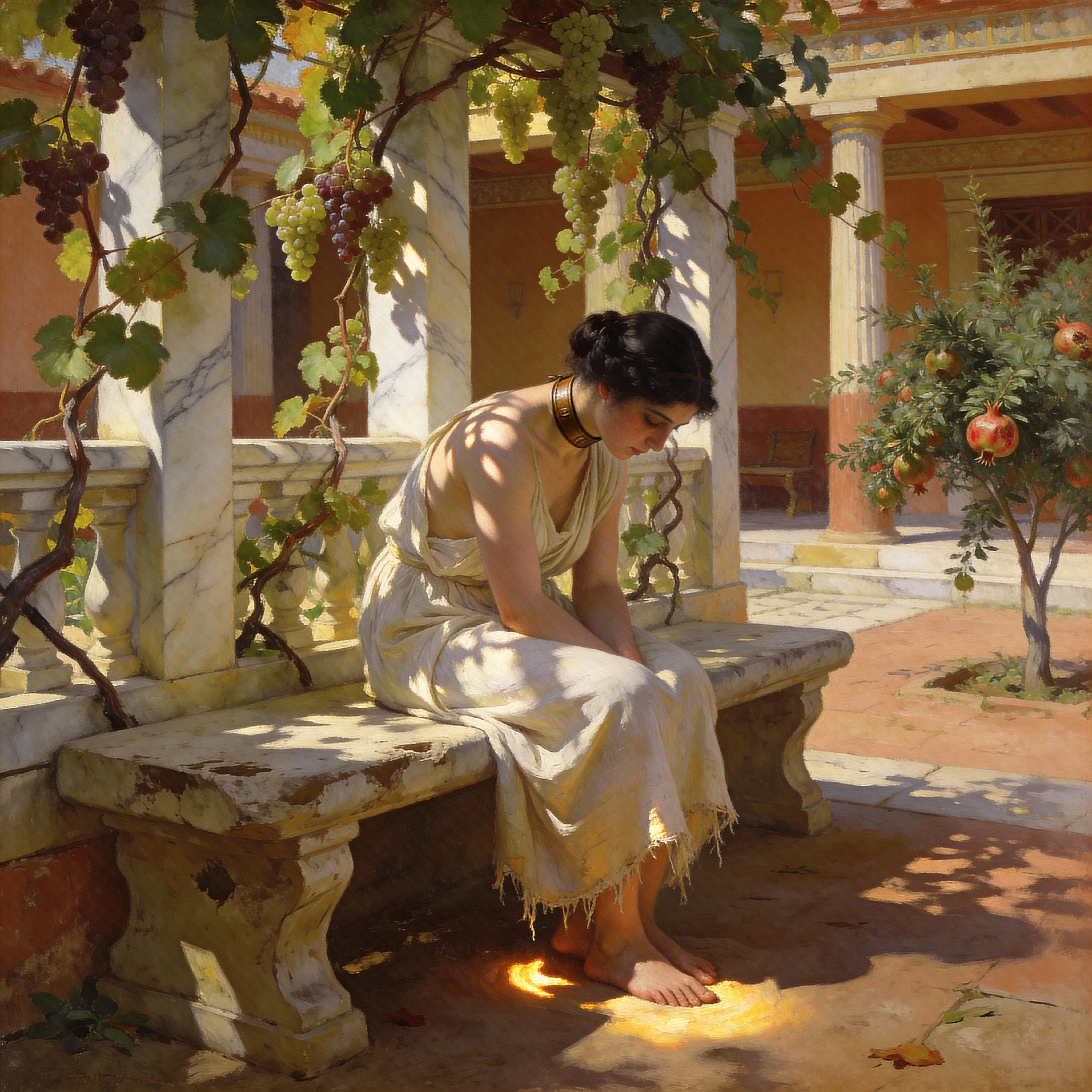 A pale-skinned Phoenician woman sitting hunched on a worn stone bench in the sun-dappled courtyard of an affluent home, her posture deliberately small beneath the weight of the narrow, unadorned leather choker encircling her throat. Her off-white chiton, threadbare at the hem, clings loosely to her frame, the rough fabric catching the light where it pools around her bare feet. Around her, meticulously tended grapevines climb marble trellises, their leaves casting shifting shadows over her lowered face, while young pomegranate trees heavy with fruit frame the scene.