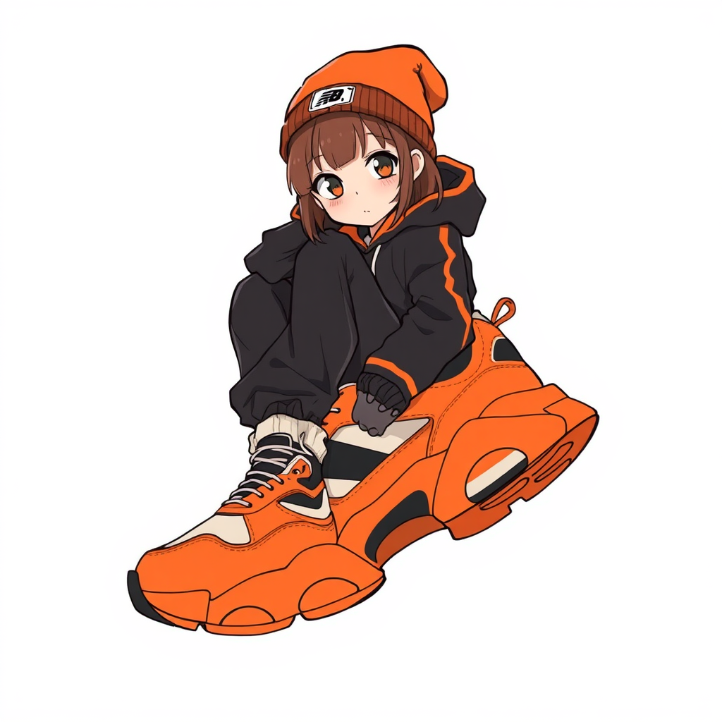 In the image, a girl is perched atop a pair of oversized sneakers in an anime-inspired drawing style. The artwork, reminiscent of a Tumblr post, elegantly incorporates elements of ukiyo-e art. She wears a stylish beanie and a casual hoodie, paired with work clothes that boast a techwear vibe. The design reflects a fusion of Tsutomu Nihei's artistic flair. Her face is adorably anime-like, yet her attire exudes a professional sports appeal, complete with sleek shoes. The palette is dominated by vibrant orange and bold black hues. The creator of this captivating piece of art is artist Mike.