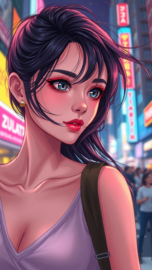Perfect anime illustration extreme closeup portrait of a beautiful woman strolling through an urban landscape, gentle breeze tousling her hair, vibrant city lights reflecting in her eyes, capturing the lively essence of the bustling streets, her serene expression contrasted against the dynamic city backdrop, subtle hints of neon colors illuminating her features, adding a touch of whimsy to the modern city scene.