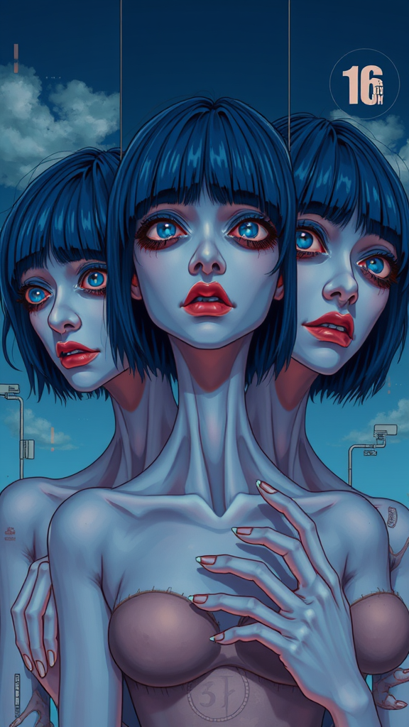 Perfect blue portrayed with artistic brilliance, utilizing cel animation techniques and vivid colors, featuring 16K resolution, UHD, and HDR. The scene exhibits duplicated and disfigured forms, with mutated and deformed features, cloned faces exhibiting cross-eyed, lazy-eyed, or unusual eye orientations. The characters have elongated necks and extra fingers on their mutated hands. The composition includes elements that might appear low-resolution or blurry, with possible jpeg artifacts, watermarks, or logos. Some images may be out of frame or poorly drawn, with split images that convey a sense of distortion and surrealism.