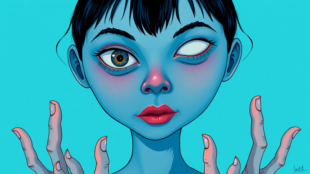 Perfect blue rendered with artistic brilliance, cel animation, vivid colors, 16K resolution, ultra high definition, high dynamic range. By duplication and disfigurement, exploring mutation, deformities, and cloning, resulting in a cross-eyed gaze, peculiar eyes, elongated neck, additional fingers, and altered hands. Out of focus elements, blurry edges, compression artifacts, with no visible watermarks, logos, or text. A composition that embraces the surreal through split imagery and slightly distorted drawings.