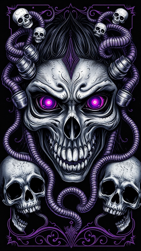 Perfect detailed eyes with a haunting glow, unnervingly sharp teeth, skeletal features resembling Amber Heard with an air of malice, surrounded by skulls and twisting tendrils in a shadowy atmosphere. Emphasize a greyscale palette with intricate linework, capturing a cinematic and psychedelic aura. The artwork is set against black paper with vibrant amethyst lines, creating an ornate and symmetrical design reminiscent of a tarot card. The piece should exude an intricately detailed ink illustration style akin to Peter Mohrbacher, incorporating elements of the golden ratio for balanced composition.