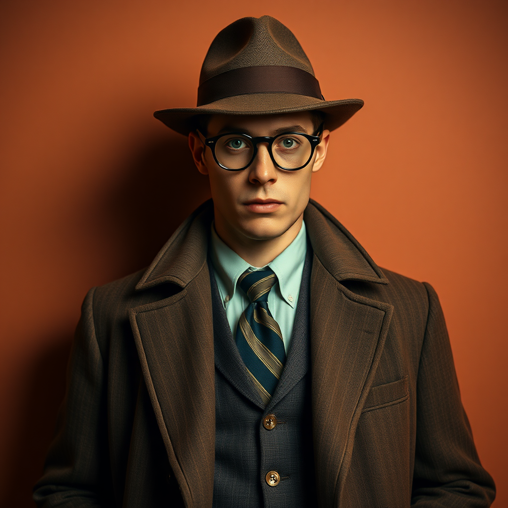 Perfect vintage detective attire meticulously arranged, infused with a Wes Anderson-inspired color scheme, captured under studio lighting with subtle, low contrast, rendered in ultra-high definition.
