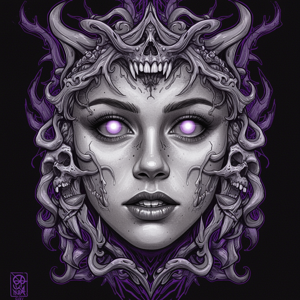 Perfectly detailed eyes, glowing with an eerie intensity, surrounded by a sinister array of creepy teeth and a skeletal structure reminiscent of a haunting visage. Channel the essence of Amber Heard with an air of malice, intertwined with skulls and tendrils to create a dark, atmospheric scene. Rendered in greyscale with intricate linework, the composition captures a cinematic and psychedelic essence. Visualize this on black paper, enhanced with vibrant amethyst linework that adds an ornate, symmetrical quality, reminiscent of a tarot card. Highly detailed in ink illustration, the style echoes the work of Peter Mohrbacher, adhering to the golden ratio for balance. Avoid elements of low resolution, poor anatomy, or overly saturated elements, focusing instead on maintaining a cohesive and hauntingly beautiful design.