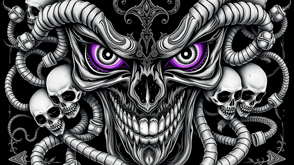 Perfectly detailed eyes, glowing with malice, creepy teeth, skeletal essence, inspired by Amber Heard, entwined with skulls and tendrils, creating a dark atmosphere. Rendered in greyscale with intricate linework, emanating a cinematic and psychedelic feel on black paper featuring vibrant amethyst lining. This ornate and symmetrical creation resembles a tarot card, embodying a highly detailed ink illustration style akin to Peter Mohrbacher, embracing the elegance of the golden ratio. Enhanced with Lyriel v1.5's 3D allure, capturing a blend of cartoon and anime aesthetics while avoiding low resolution or flawed anatomy, maintaining a mature and intricately designed composition with subtle creative modifications.