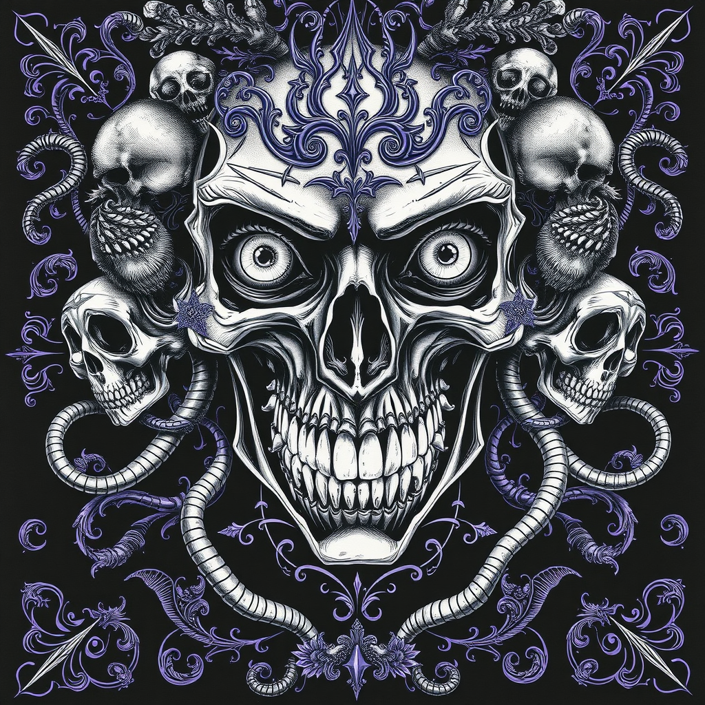 Perfectly intricate eyes, with an ethereal glow, and unnerving teeth set within a skeletal visage, inspired by the enigmatic aura of Amber Heard, exuding malice. Enveloped by intricate skulls and sinuous tendrils, creating a dark and atmospheric composition in greyscale. The linework is exquisite and cinematic, infused with psychedelic elements on black paper. Vibrant amethyst lines form ornate, symmetrical patterns reminiscent of tarot cards, meticulously detailed in an ink illustration style akin to Peter Mohrbacher. The arrangement follows the golden ratio, emphasizing harmony within the complexity.