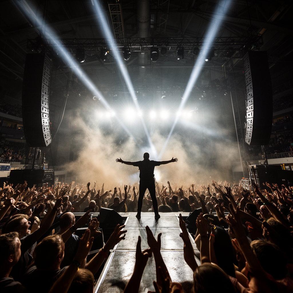 A powerful concert scene features a silhouetted performer on a large stage, arms wide open to a cheering crowd. Dramatic spotlights cut through thick smoke, creating an energetic and immersive atmosphere.