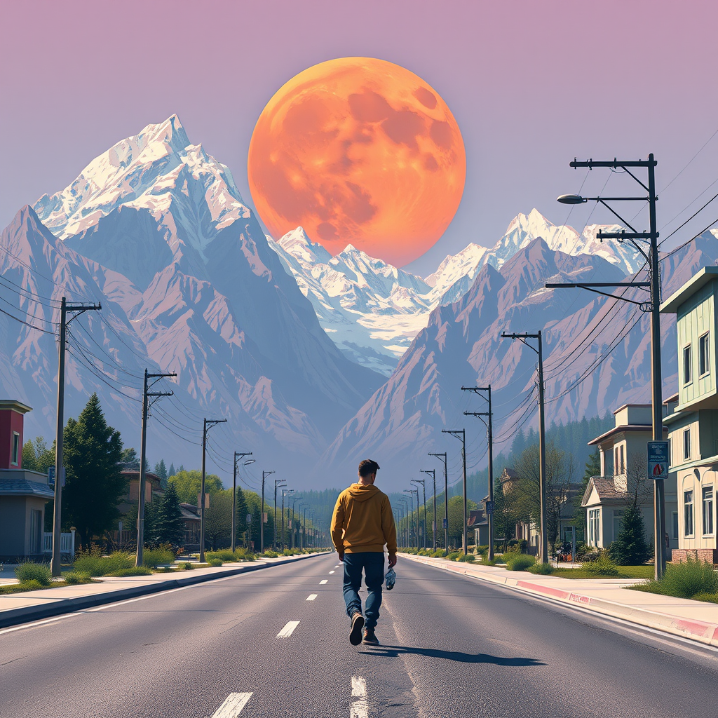 Person strolling along a street with majestic mountains looming in the distance, inspired by Beeple's style; digital art featuring a stunningly detailed illustration of an orange planet and a massive moon. Super detailed color in low poly art, with intentionally low resolution and intriguing textual errors. Visual quirks including missing, extra, or fewer fingers and digits, result in curious anatomical oddities like extra limbs or disfigured features. The scene may be strangely cropped, displaying JPEG artifacts, a mysterious signature, and tiling mishaps. The overall artwork embraces its blurry, fuzzy, and sometimes even gross or ugly errors, with mutant-like, misshaped qualities, and possible watermarks.