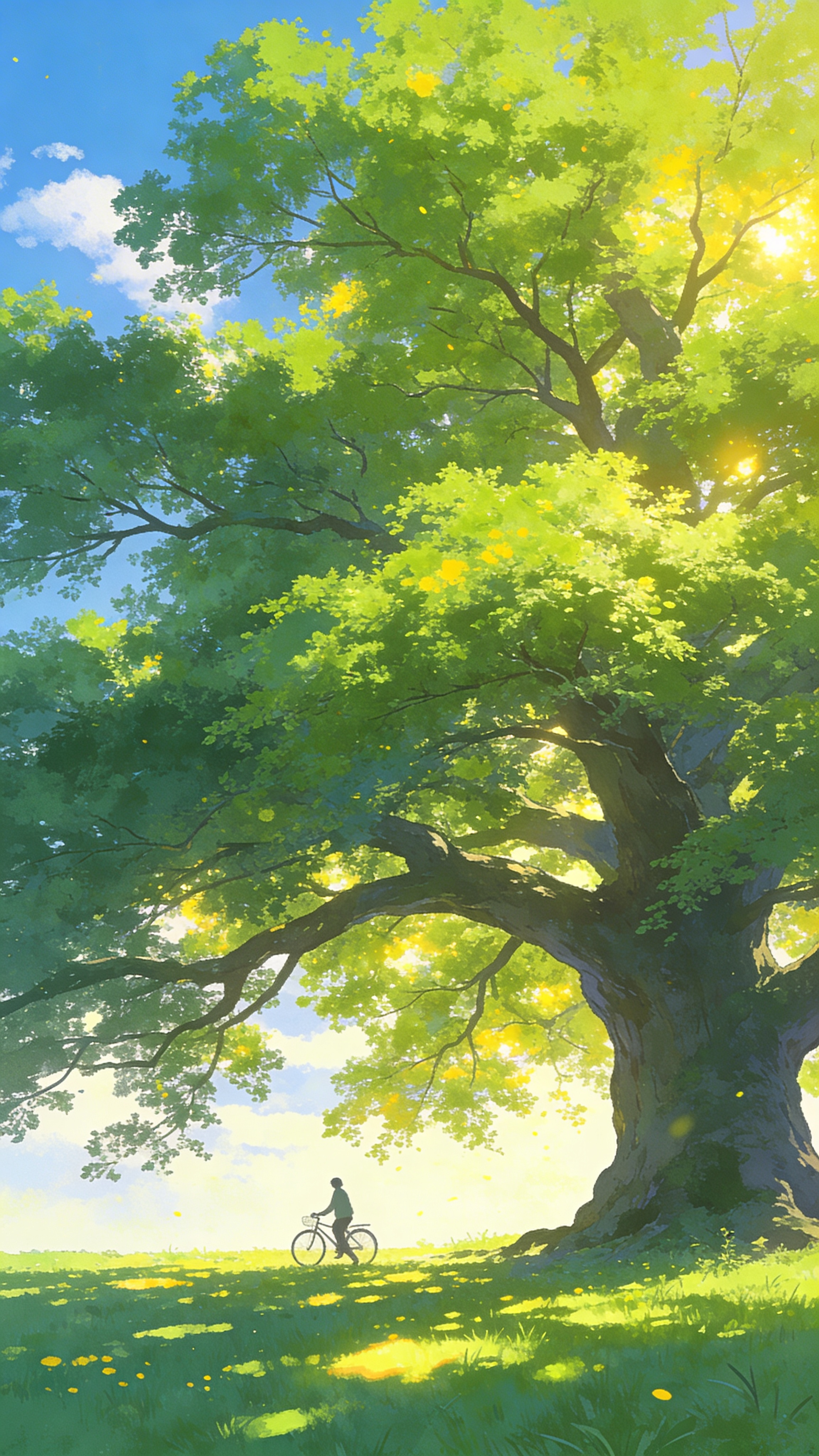 Anime style, a solitary person with a bicycle, walking on a sun-dappled grassy field. A massive, ancient tree with vibrant green foliage dominates the upper two-thirds of the vertical frame, its branches extending wide. Bright sunlight filters through the leaves, creating glowing highlights and dappled shadows on the ground. The sky is a soft, clear blue with faint white clouds. The mood is peaceful and serene, evoking a warm summer day. Colors are dominated by various shades of green for the tree and grass, with bright yellow-green highlights from the sun, and a light blue sky. The composition is expansive, with the tree as the central focus and the person small in comparison, emphasizing nature's grandeur. Delicate ray tracing, painterly, soft gradients.