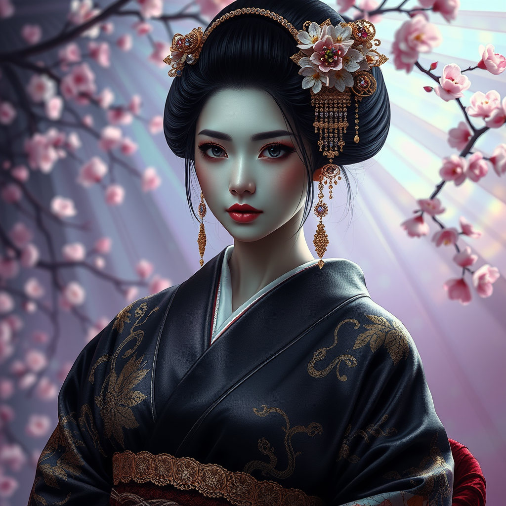 Phantasmagoric iridescent portrait of a melancholic Japanese geisha with an abyssal gaze, adorned with an intricately layered kimono embroidered with gold accents and serpentine motifs, against a kaleidoscopic backdrop of shifting cherry blossoms and lilac tulle, with realistic depictions of delicate golden circlets, gemstone encrusted combs, and ornate fans, rendered in hyper-detailed Super-Resolution, showcasing the geisha's porcelain-like complexion, expressive raven-black kimonos, and feathery silken undergarments, all bursting with hyper-realistic textures, sublime color gradations, and atmospheric depth.