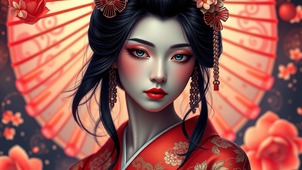 Phantasmal radiant portrait of a Japanese black-haired geisha with a melancholic expression, vibrantly colorful and exquisitely detailed, graceful, hypermaximalist style, incredibly intricate, featuring ultra-high resolution and megapixel clarity, breathtakingly realistic and majestic.