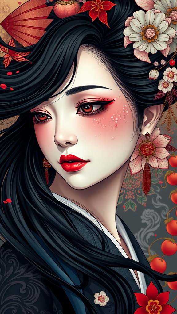 Phantasmal radiant portrait of a Japanese geisha with flowing black hair, a melancholic expression, and intricate design elements, vibrant and richly detailed, merging elegance with hyper-realistic features, grand in scope, capturing every nuance in ultra-high resolution.