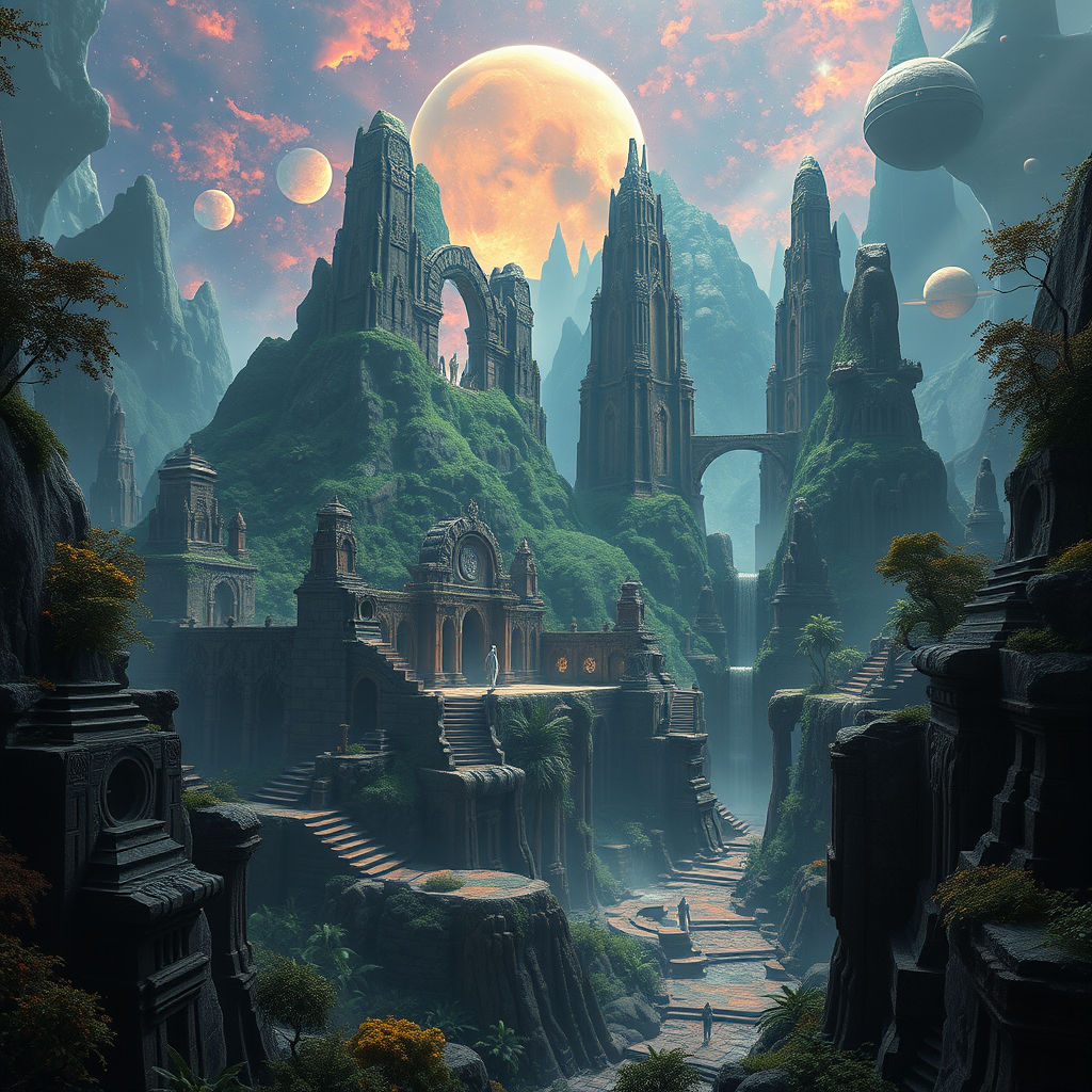 Phase-Space Celestial Jungle, Ancient Ruins, Hyper-realistic, Octane Rendering, Unreal Engine, Intricate Matte Painting, Fantasy Artwork, 8k Resolution, Deviantart Gothic Marvel --no Human Presence