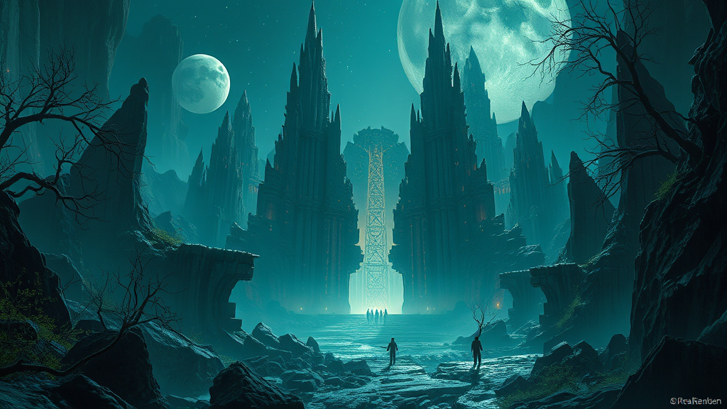 Phase-Space Mystical Wilderness, Ancient Ruins, Ultra-realistic, Octane Render, Unreal Engine, Intricate Matte Artwork, Fantasy Illustration, 8k Resolution, Deviantart Dark Fantasy Marvel --no Figures