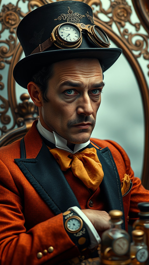 Phileas Fogg's gazes out into the fog-shrouded horizon from a intricately embroidered, copper-plated dressing table mirror, his piercing blue eyes framed by a pair of goggles perched atop his forehead, the sides of his gleaming sharks-tooth-encrusted top hat skewed, as if the force of his rapid globetrotting had dislodged them in the whirl of activity, the glint of polished obsidian cufflinks and a pocket watch gleaming on his immaculate, three-piece suit of burnt orange, rust, and midnight blue, a treasured silk cravat made from material rescued from the Great Exhibition's unpacked crates, now toned to a warm, fawn-like patina, the chair behind him enriched with an elaborate, occult-inspired inlay of brass filigree and polished ivory, amidst a variegated ensemble of petite, silver and obsidian vials, globes, hourglasses, and lamplight lenses are neatly arranged upon the chair's substantial armrests, conveying an air of brazen, contradcimal whimsy, rationality, or questionable hyper-stationary grounding between his charged reminiscences of sublime adventure, immergible personal exploits, or puzzled speculative inquiries regarding continental impermeability and the momentous sequence of leakages, noticeable improvements in deleterous cleanliness sealed gadget theories, and ever verdant agricultural opinions.