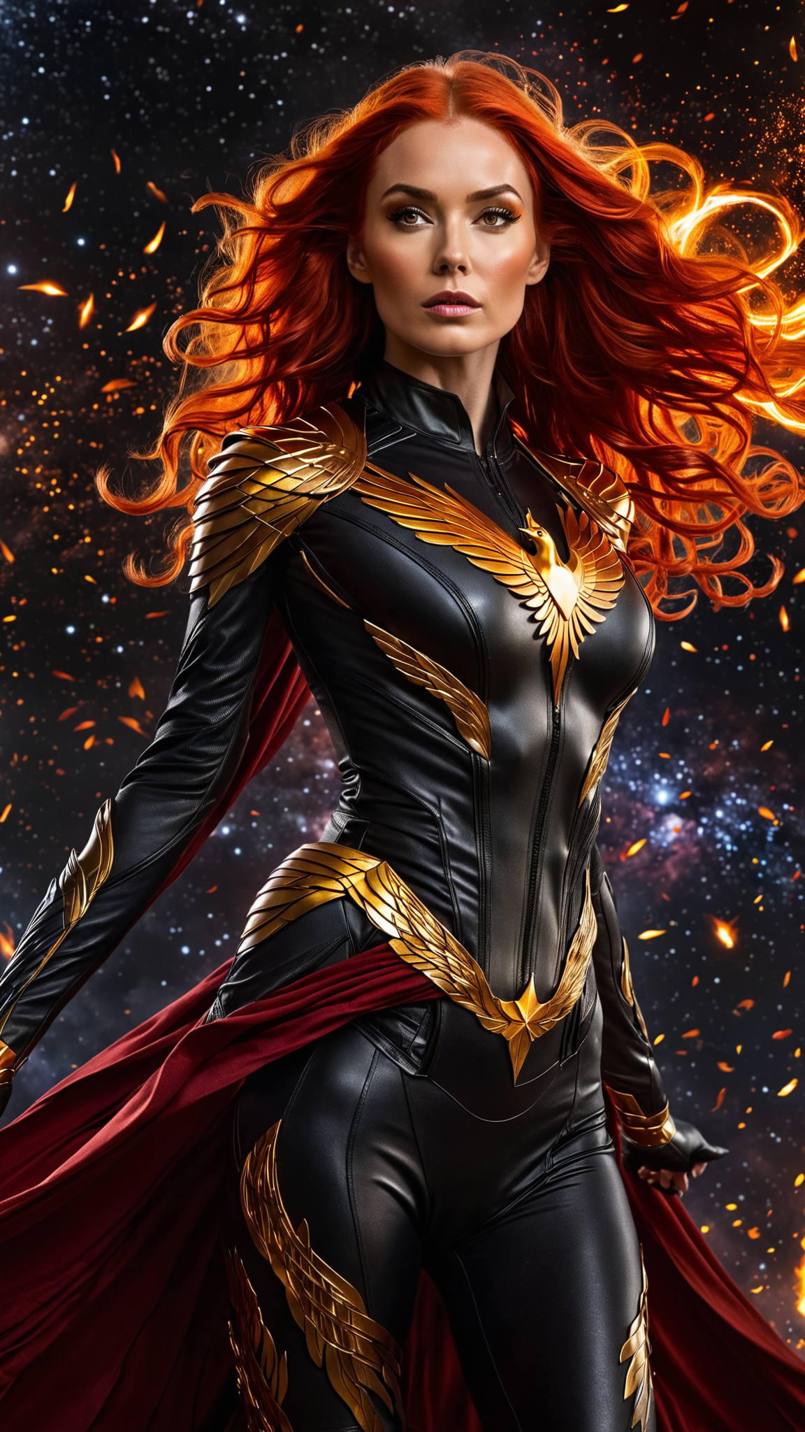 Phoenix/Jean Grey in her Phoenix costume, but it's dark black with metallic gold, a golden fiery falcon symbol on the front of her costume, the sash around her waist blowing in the cosmic winds. She is surrounded by her fiery Phoenix raptor/falcon aura, she is within the firebird . Her eyes are lit up like stars. Her hair is beautiful red flames, flaring out. Full body pose. She is in space, on the edge of a galaxy.