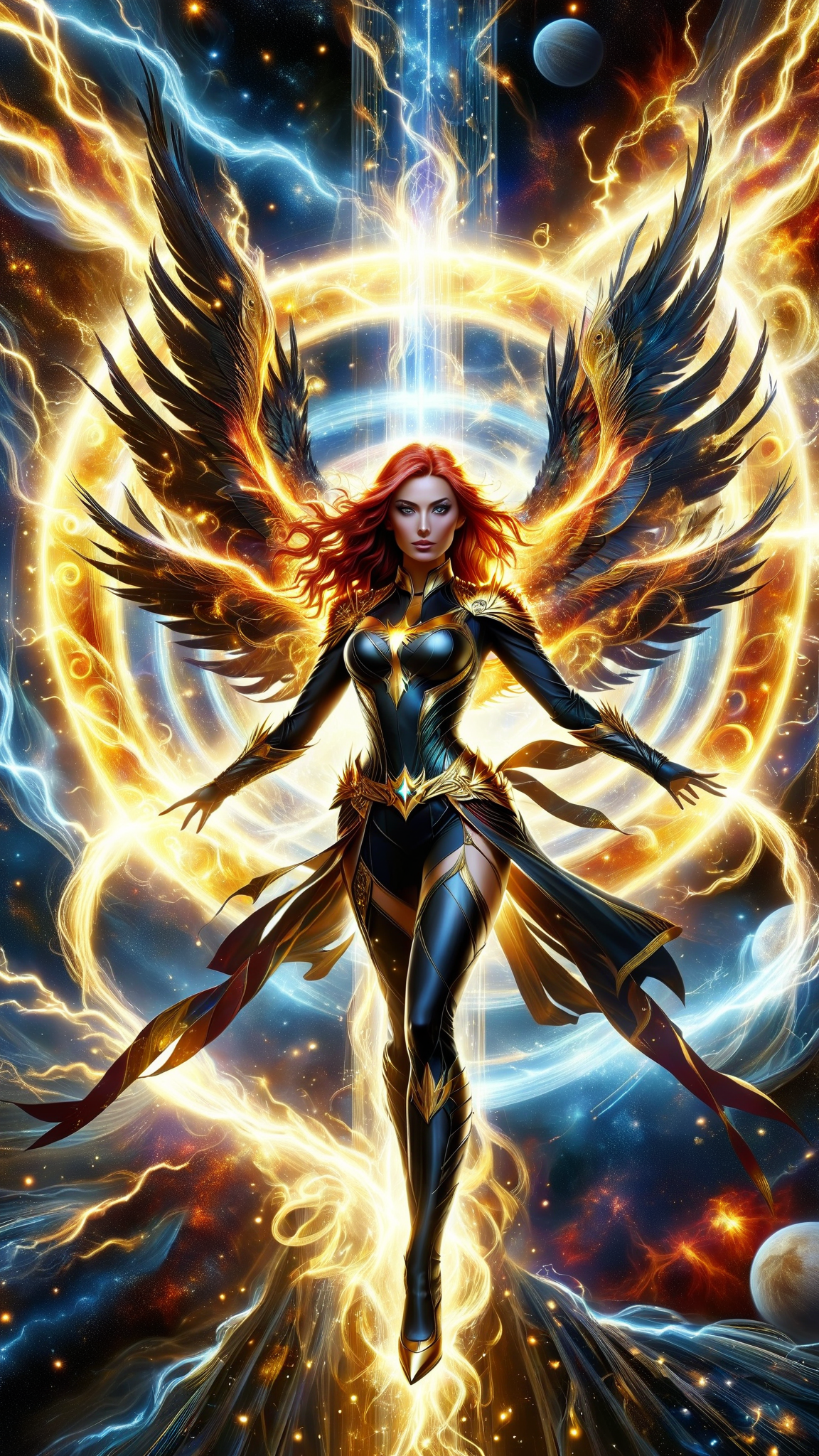 Phoenix/Jean Grey in her Phoenix costume, but it's dark black with metallic gold, a golden fiery falcon symbol on the front of her costume, the sash around her waist blowing in the cosmic winds. She is surrounded by her fiery Phoenix raptor/falcon aura, she is within the firebird . Her eyes are lit up like stars. Her hair is beautiful red flames, flaring out. Full body pose. She is in space, on the edge of a galaxy.